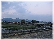 右京区の史跡名勝嵐山にあり大堰川(桂川)に架かる橋。承和年間(834-48)僧道昌が架橋したのが最初